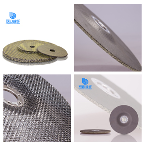 “羅邊玻璃纖維增強(qiáng)砂輪網(wǎng)片 是采用玻璃纖維增強(qiáng)網(wǎng)布涂以酚醛、環(huán)氧改性樹(shù)脂,經(jīng)烘培后沖切而成,裁切采用外徑、內(nèi)孔一次沖切成形工藝。因此,網(wǎng)片具有尺寸公差小,同心度好,周邊光潔等優(yōu)點(diǎn)。該產(chǎn)品主要為不織布復(fù)合網(wǎng)片、黒紙復(fù)合網(wǎng)片和純網(wǎng)片,具有極好的耐熱性、高速切割性能及高結(jié)構(gòu)強(qiáng)度。“